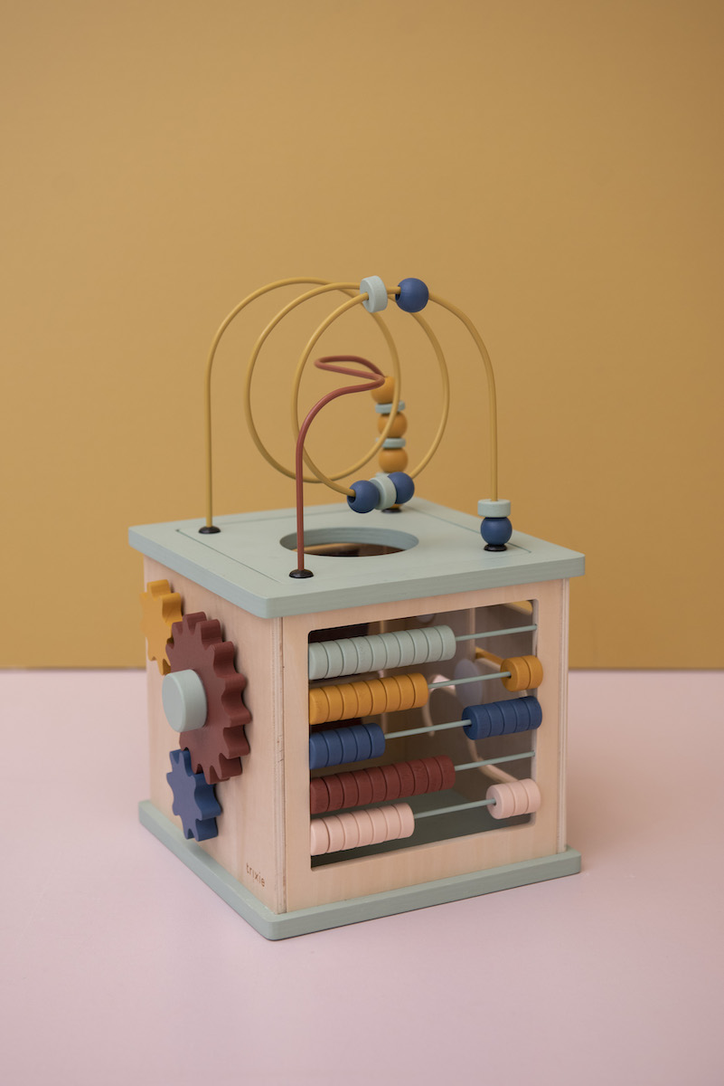 Nooit een saai moment met deze activiteitenkubus in de buurt! De kubus bevat 5 leuke en uitdagende activiteiten in één stuk speelgoed waar kinderen lang plezier van zullen hebben. Aan de bovenzijde vind je twee spiralen met kleurrijke kralen. Aan de zijkant kan je puzzelen met onze dierenvrienden. Maak gekke wezens of zoek de bijpassende boven- en onderkant van elk dier. De activiteitenkubus bevat ook een telraam om telspelletjes te spelen en een set tandwielen om rond te draaien. De bovenzijde kan ondersteboven worden gedraaid om de activiteitenkubus compact op te bergen. Met zijn vele verschillende functies staat dit speelgoed garant voor urenlang speelplezier! Al spelend met kleuren, cijfers en vormen ontwikkelen kinderen hun fijne motoriek en ruimtelijk inzicht. De activiteitenkubus is gemaakt van 100% FSC ® gecertificeerd hout. Alle verven zijn op waterbasis en veilig voor baby’s.